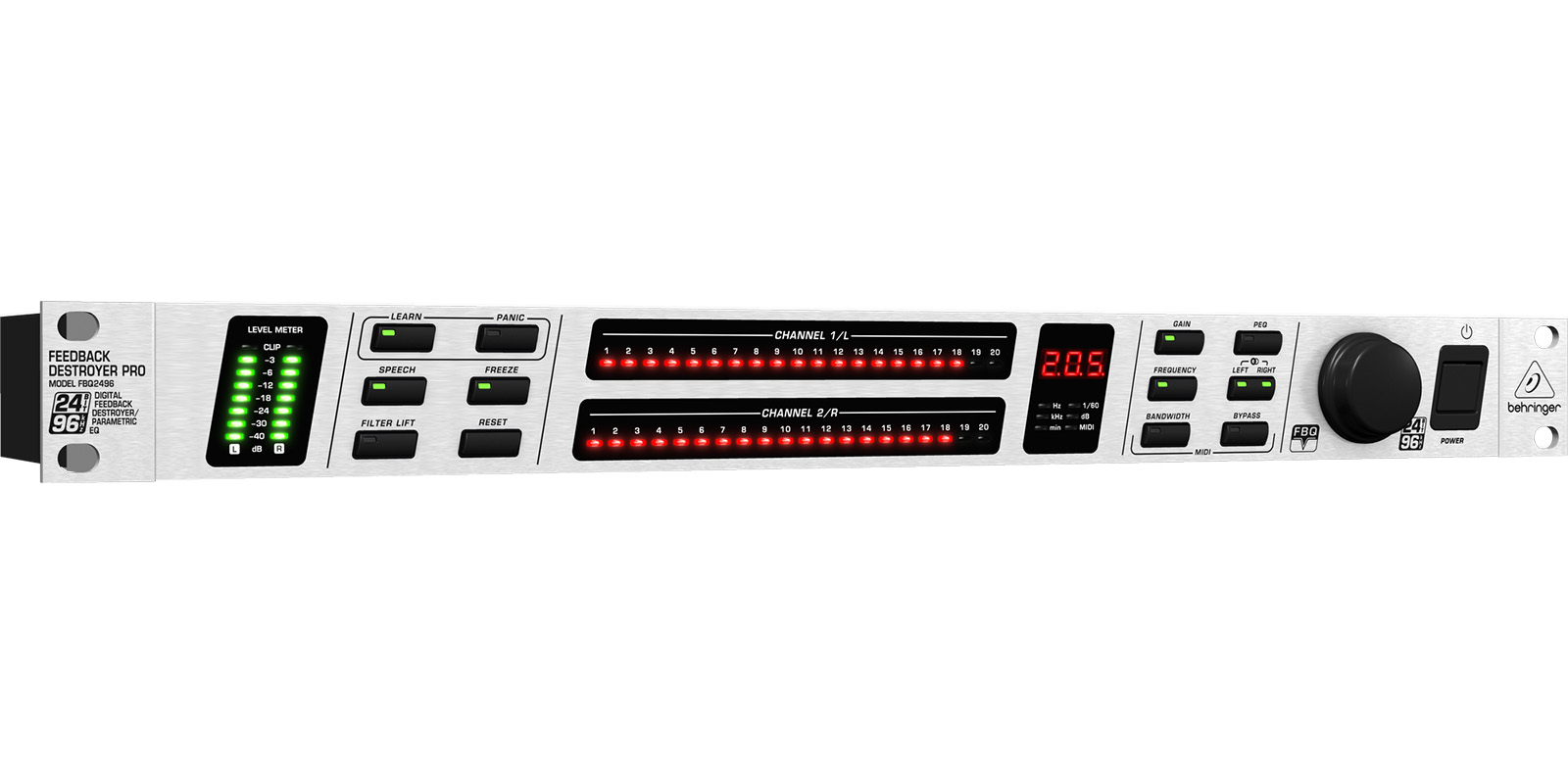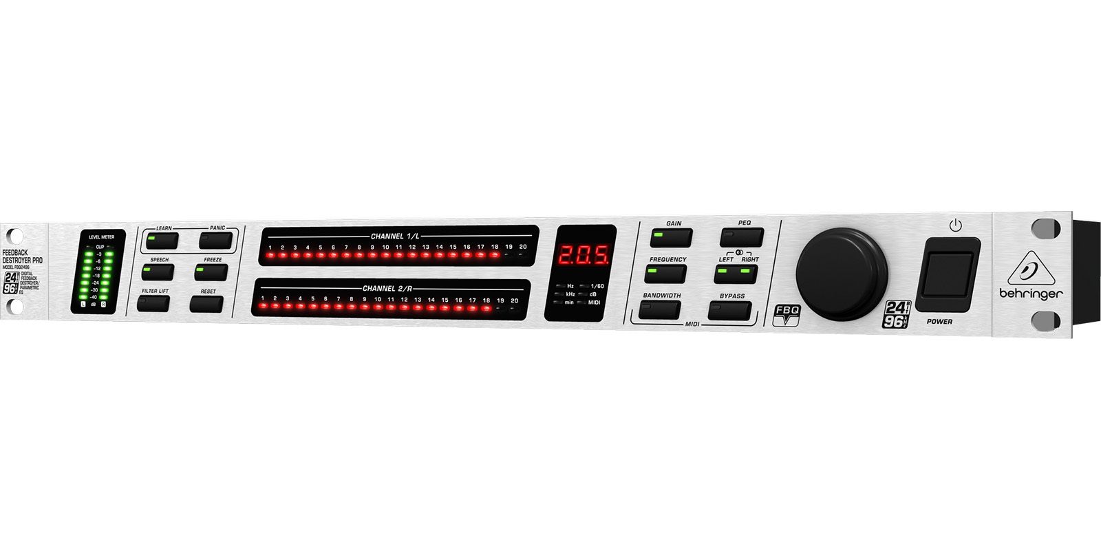 Utilizando un algoritmo de detección de retroalimentación ultra rápido, el FBQ2496 localiza automáticamente e inteligentemente hasta 20 frecuencias de retroalimentación por canal. El algoritmo entonces fija los filtros de narrow notch (hasta 1/60th de una octava) para destruir las frecuencias de retroalimentación, dejando el resto de tu señal virtualmente virgen. Y con el ajuste predeterminado “Set-and-Forget” y el botón de pánico, el destructor de retroalimentación puede estar activo y en funcionamiento en cuestión de segundos.