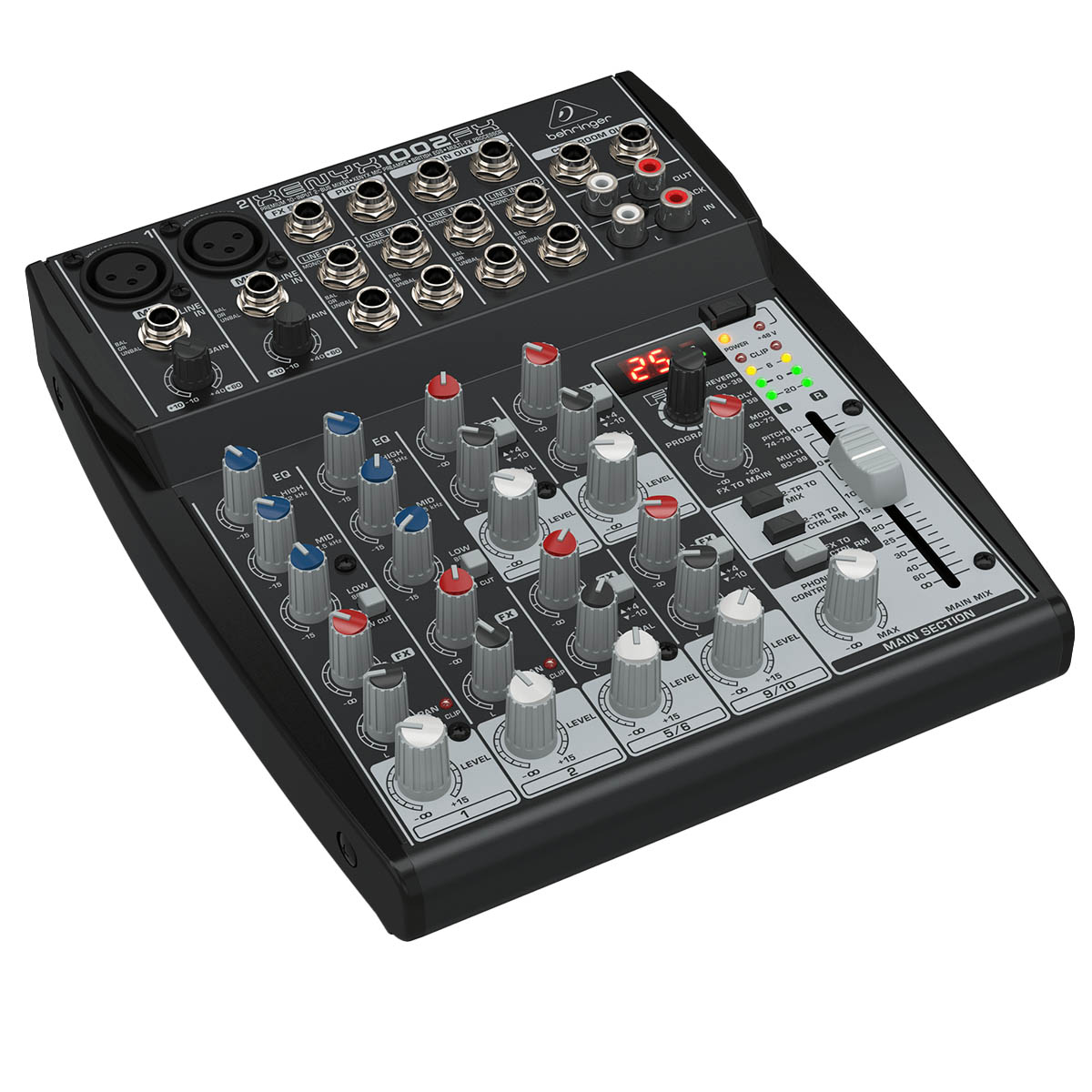 El mezclador analógico XENYX 1002SFX cuenta con 10 entradas para transmisión, podcasting o aplicaciones en vivo, preamplificadores de micrófono XENYX con alimentación fantasma de 48 V. La serie XENYX “S” se puede conectar a cualquier computadora o dispositivo móvil, También se puede utilizar como un submezclador versátil para alimentar dispositivos de audio habilitados para red con varias otras señales de audio. Dos canales mono con EQ y Low Cut, más 4 canales estéreo, una entrada de transmisión RCA estéreo y una entrada USB estéreo un total de 14 señales de audio para transmisión, monitoreo a través de auriculares o salidas TRS y procesador Klark Teknik FX con cien preajustes. El 1002SFX presenta controles de nivel, panorama/balance y envío de efectos en todos los canales y permite modelar el sonido con precisión para cualquier fuente de entrada. Los canales mono tienen controles de ganancia adicionales y ecualizador de 3 bandas con corte de graves conmutable, mientras que los canales de nivel de línea estéreo ofrecen un refuerzo de 12 dB conmutable. El control de envío de efectos por canal le permite usar los programas de efectos estéreo internos y/o conectar cualquier procesador de efectos externo de su elección. Finalmente, un fader principal de 60 mm asegura un control de volumen extremadamente suave de su mezcla de salida.