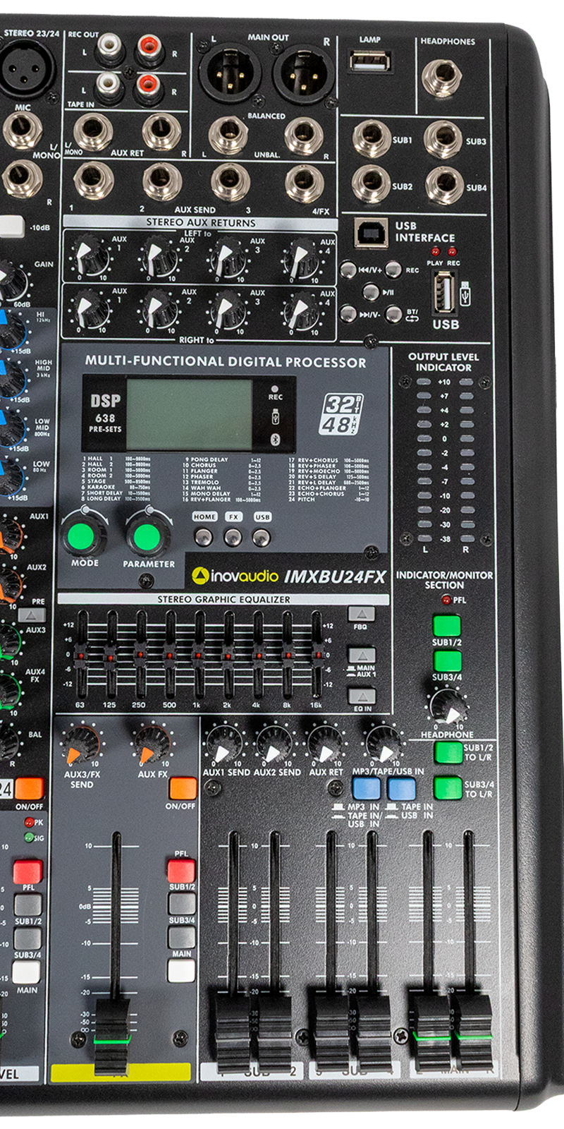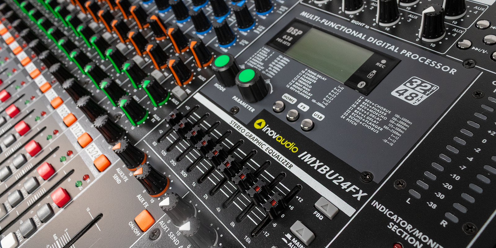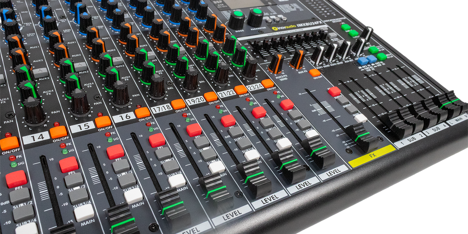 La IMXBU24FX es una mezcladora analógica profesional de 24 canales diseñada para aplicaciones de audio en vivo, estudios de grabación, escuelas, iglesias, bandas y eventos de mediana a gran escala. Su arquitectura combina una interfaz intuitiva con procesamiento digital avanzado, ofreciendo control total, versatilidad y calidad de sonido excepcional.