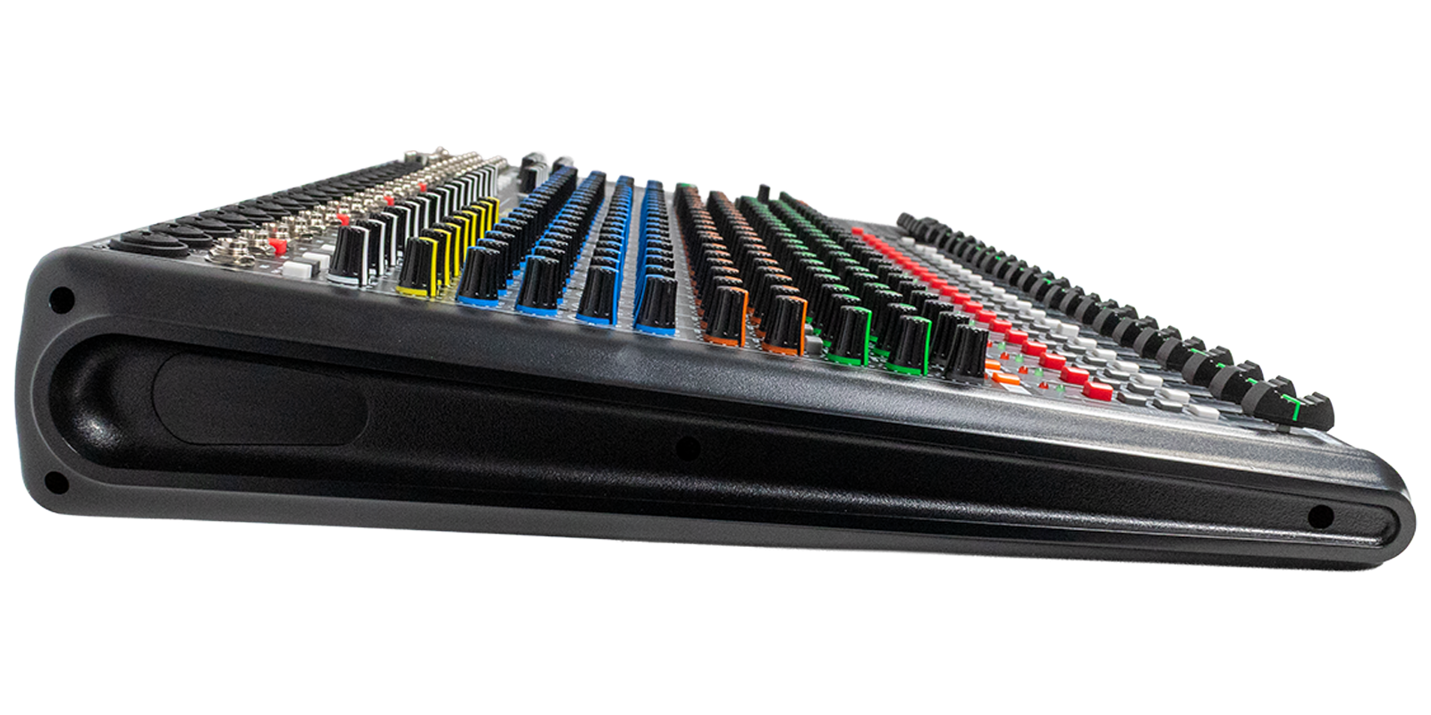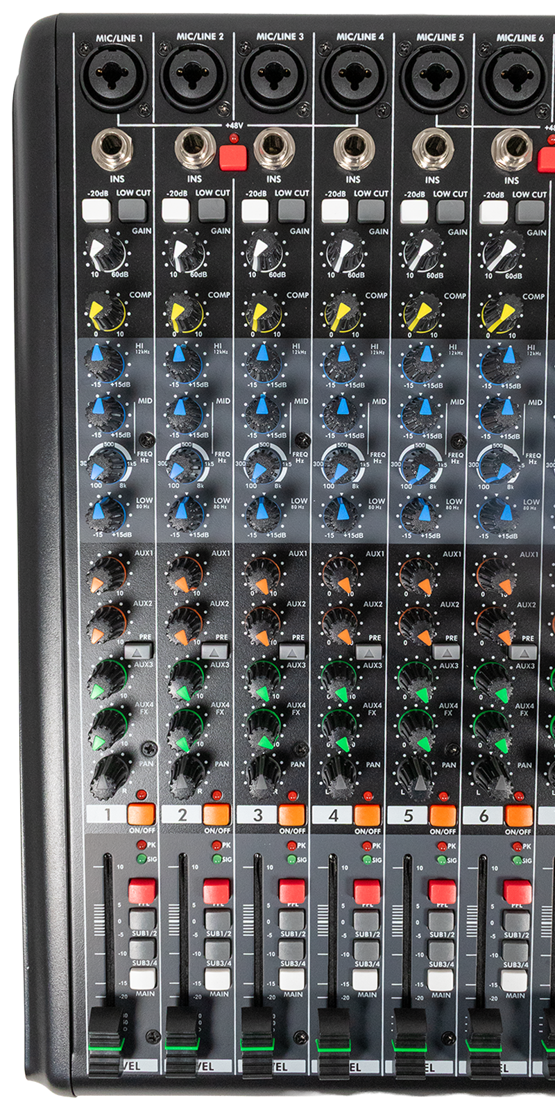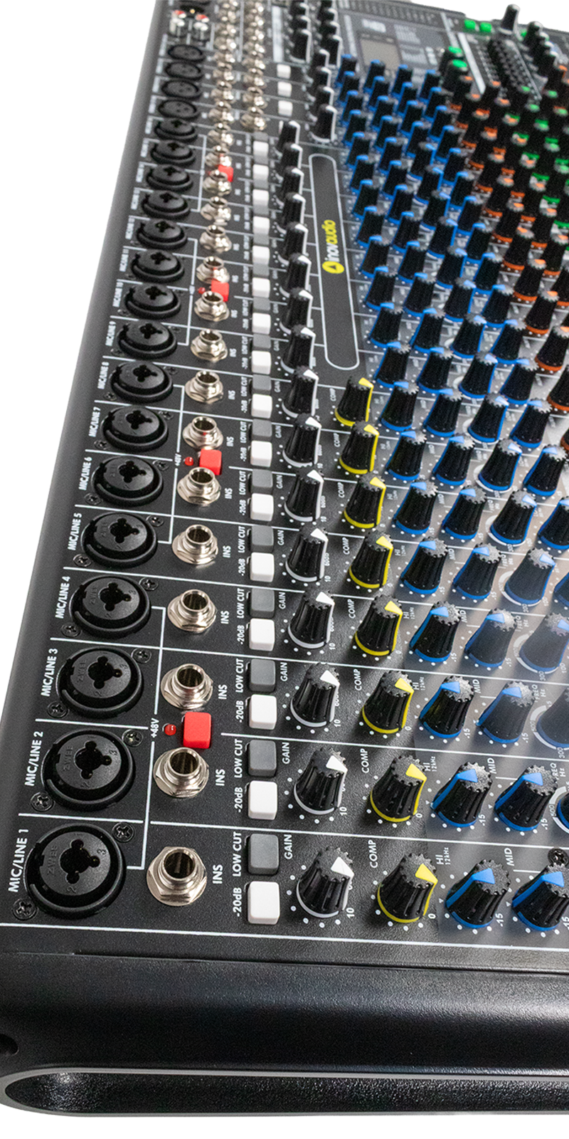 Cada canal cuenta con preamplificadores de bajo ruido, compresores ajustables y ecualizadores paramétricos, además de soporte para micrófonos de condensador con phantom power. El sistema de detección de retroalimentación FBQ ayuda a eliminar acoples rápidamente, y sus salidas balanceadas, rutas de mezcla flexibles y faders de 60 mm hacen de esta consola una herramienta indispensable para técnicos de audio profesionales.