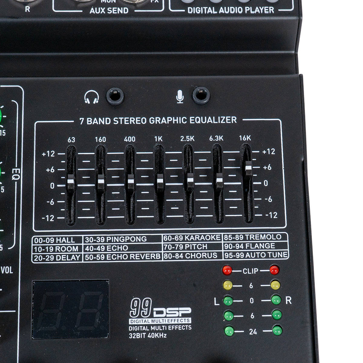 Main Out, 2 Auxiliares, salida de audifonos