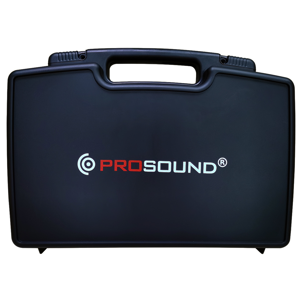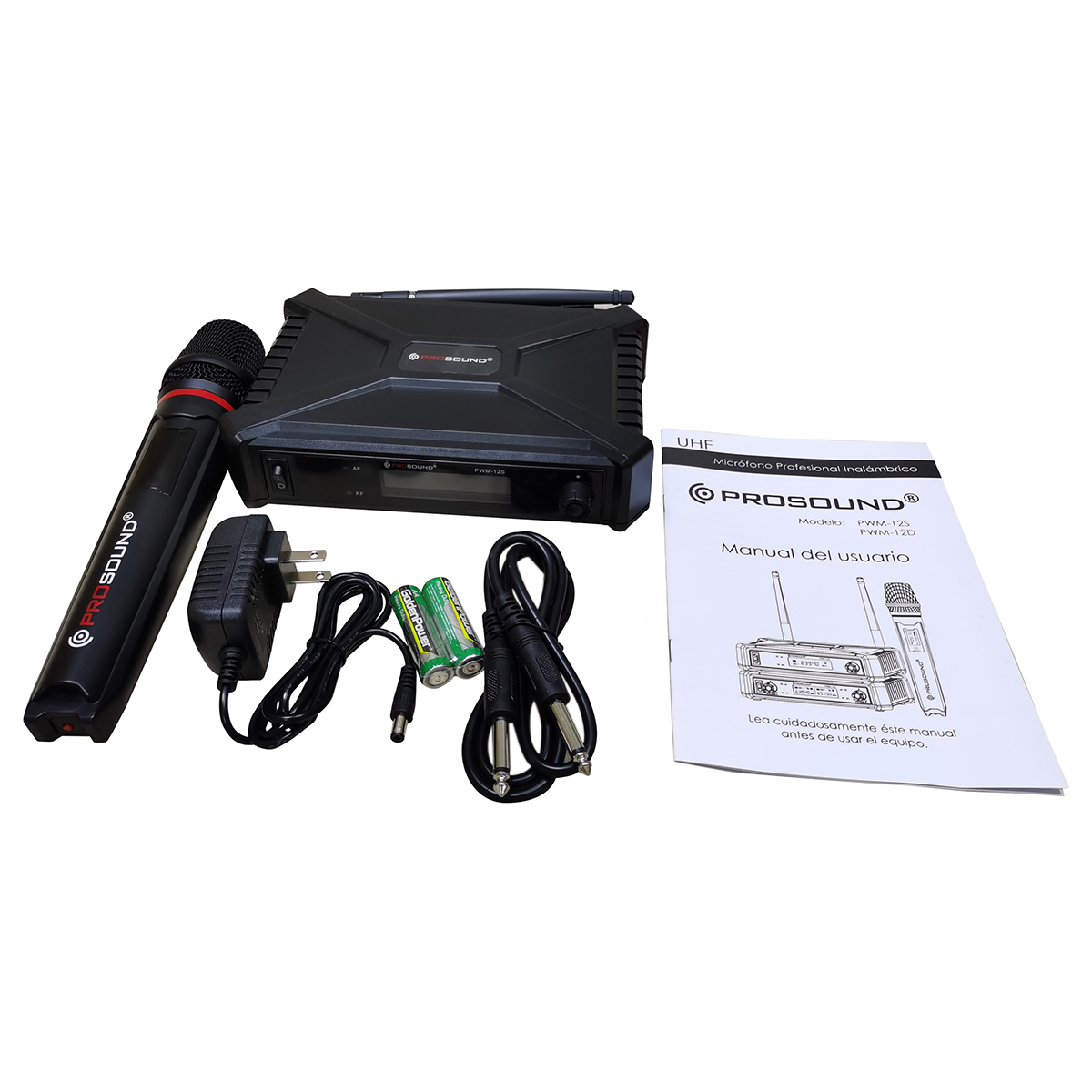 Un receptor, un transmisor de mano, 4 pilas AA, un cable de 6.3 mm, adaptador de corriente y manual de usuario.