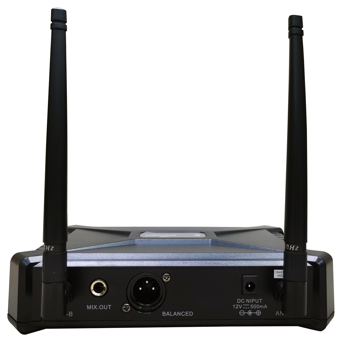 Banda UHF.Un canal.Rango de frecuencia de 687.2 – 668.3 MHz.Botn de encendido.Volumen A.Indicador de frecuencia automtica.Indicador de radio frecuencia.Rango dinmico de 96 dB.Respuesta de frecuencia: 30 a 20 KHz (2 dB).Sensibilidad de -95 dBm.Voltaje: DCV12V 500 mA.Una salida de 6.3 mm y una salida XLR balanceada.