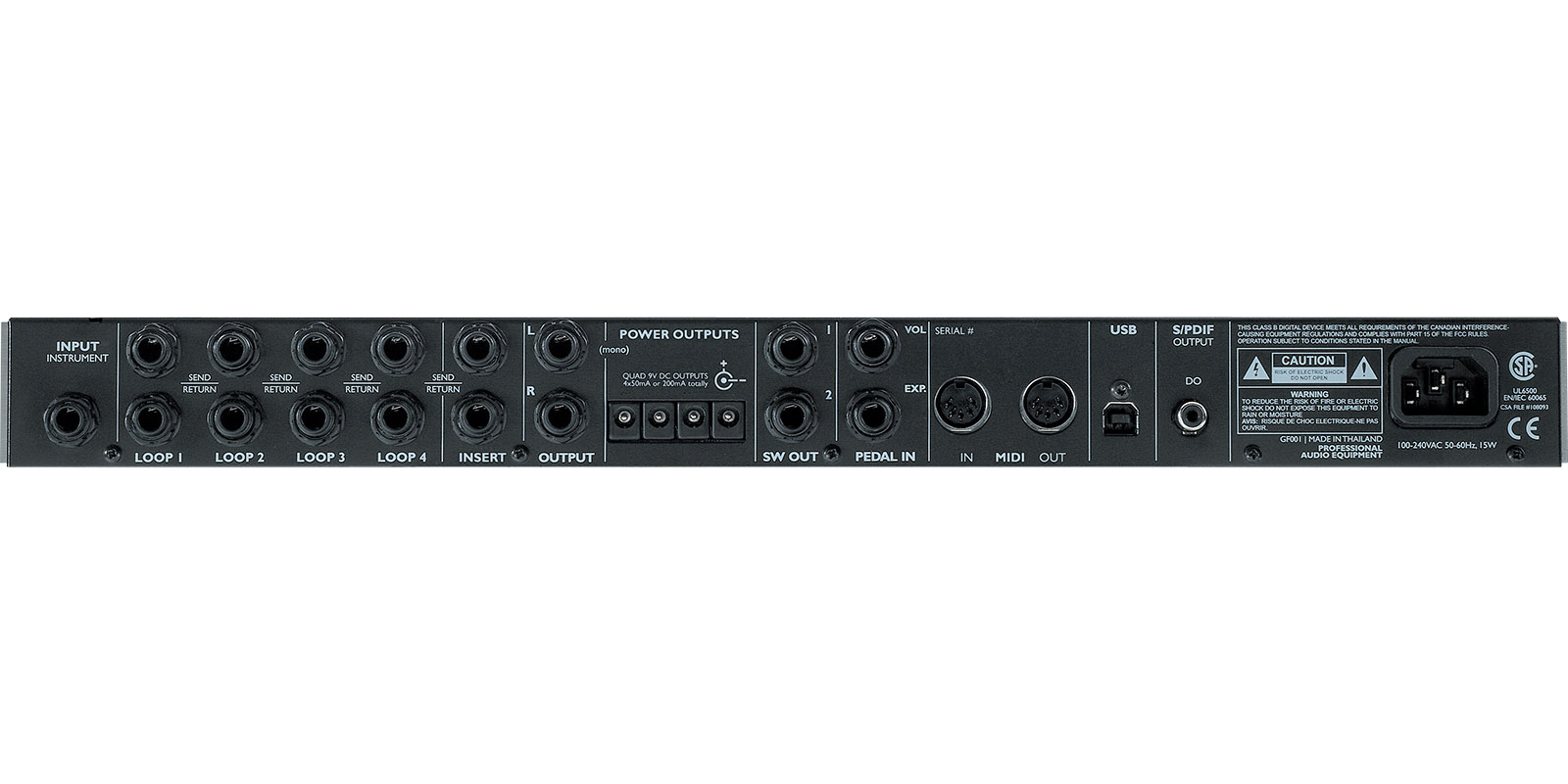 MIDI: Entrada/salida: DIN 5 puntas.USB: USB 1.1, tipo B.Pedal (Expresin y volumen): Cuatro conectores estreo de 6.3 mm (2 en GFX01, 2 en unidad de control).Rel de contacto (separe punta y anillo de lateral): 4 rels en dos conectores estreo de 6.3 mm para cambio de canales de amplificador.