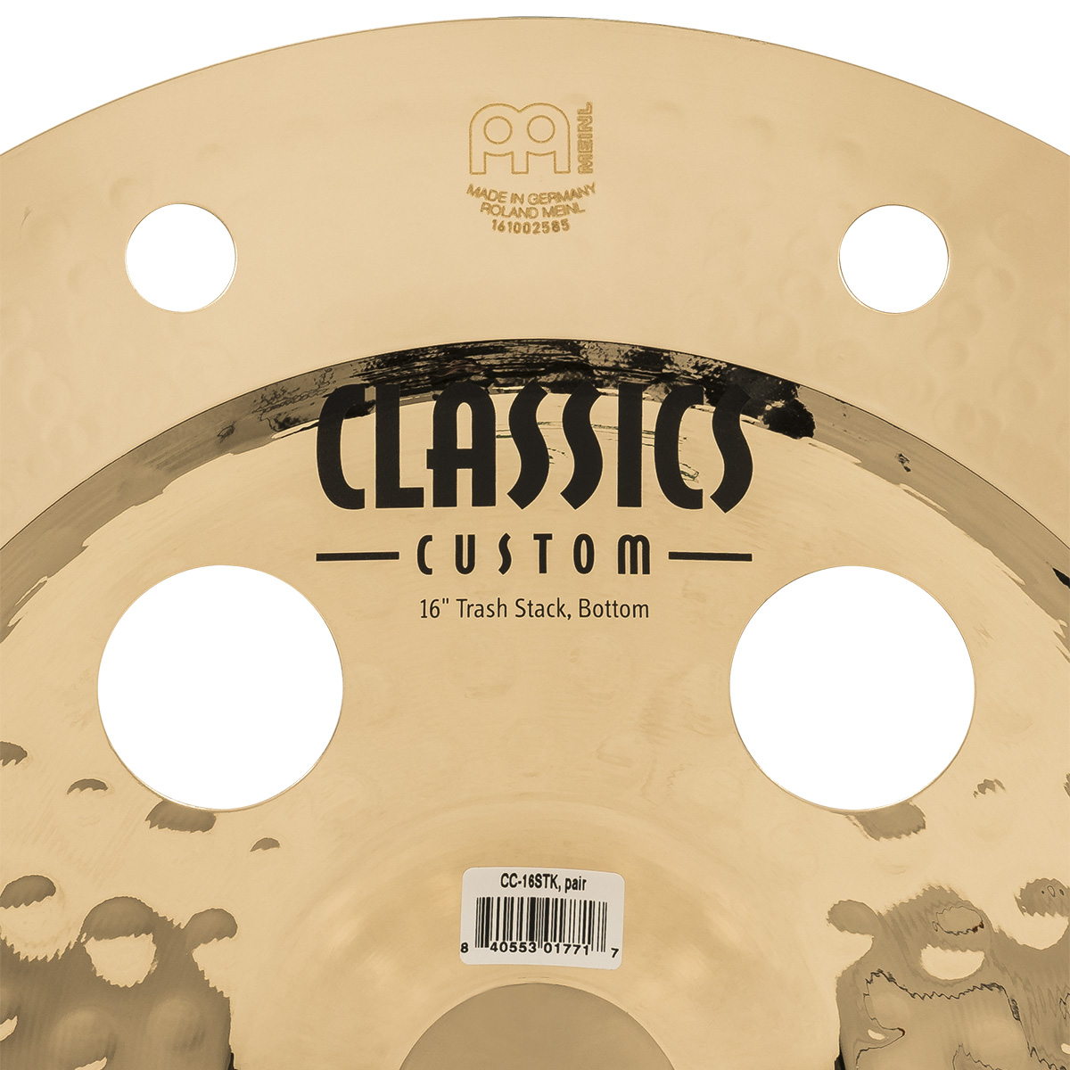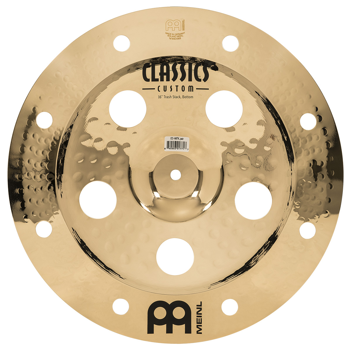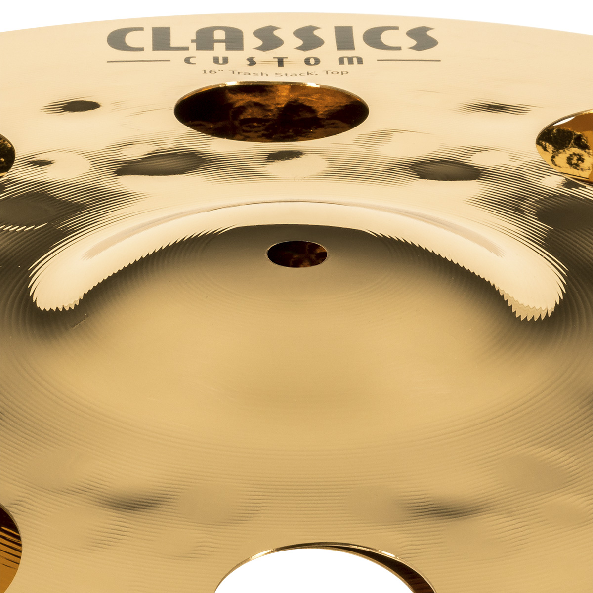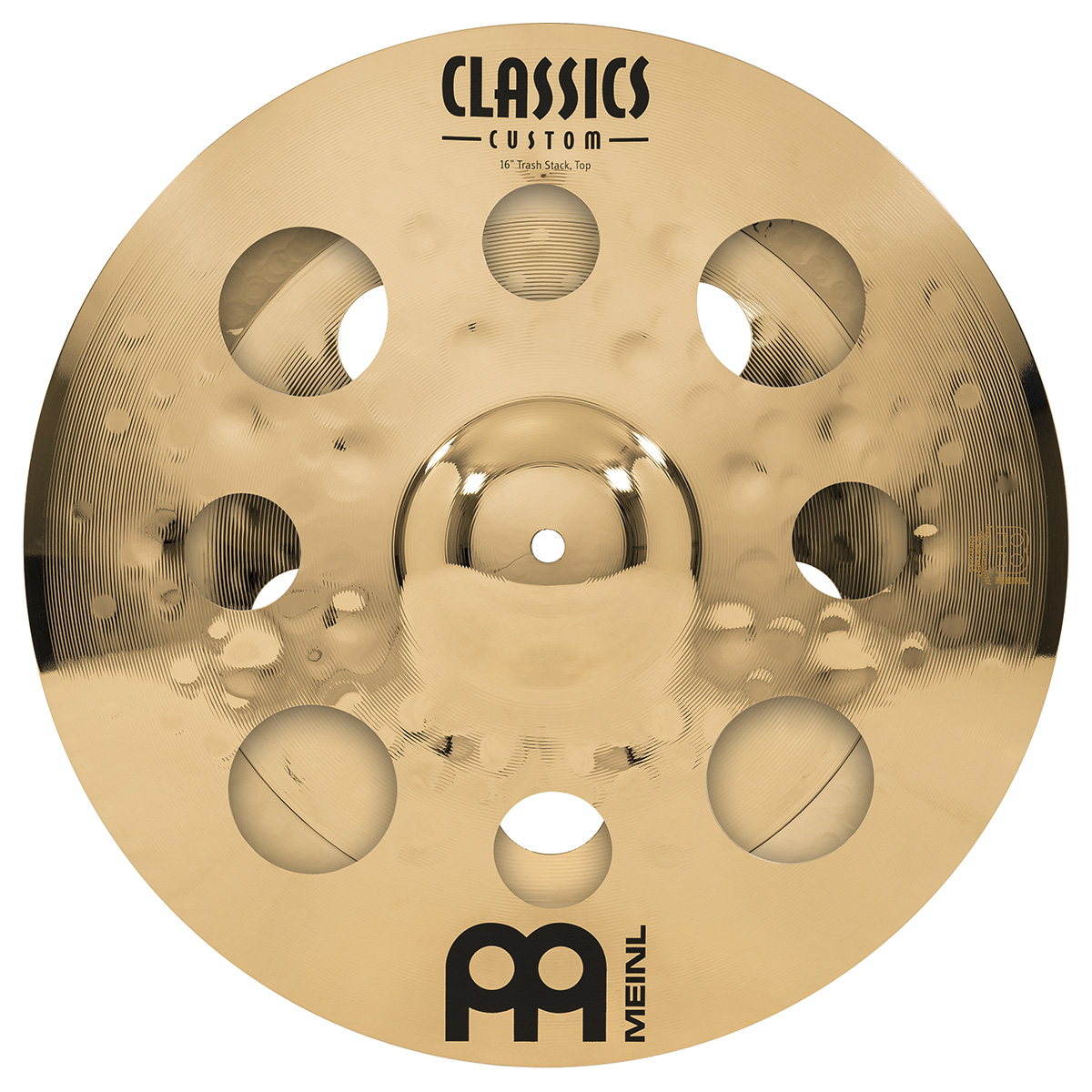 Trash-Stack Classic Custom de 16” pulgadas, fabricado con aleación de bronce B12, martillado por computadora, terminado brillante, gran sonido, timbre brillante, carácter abrasivo y brillante, tono agudo, volumen medio, sustain corto, peso ligero.