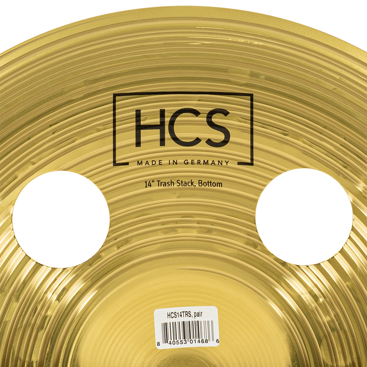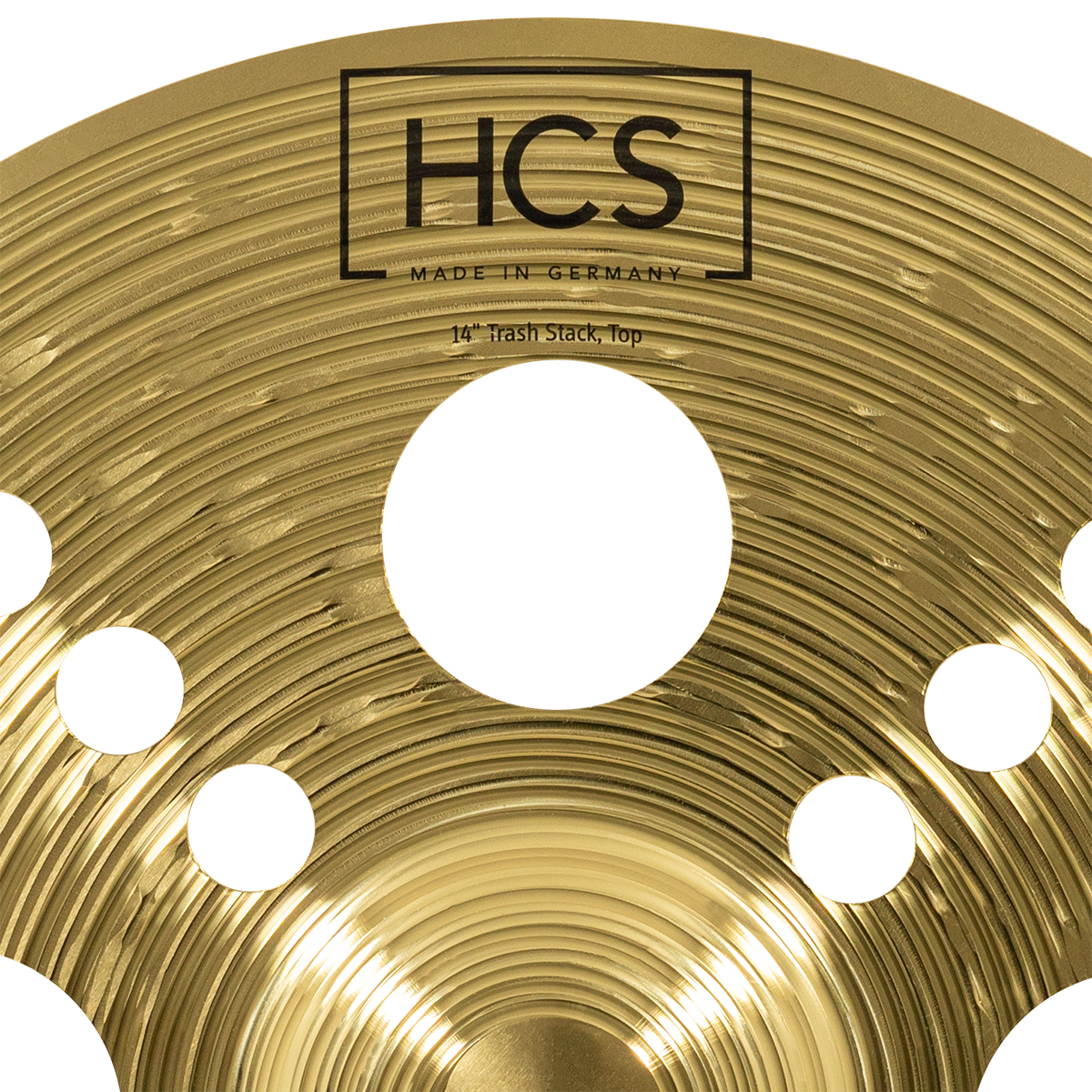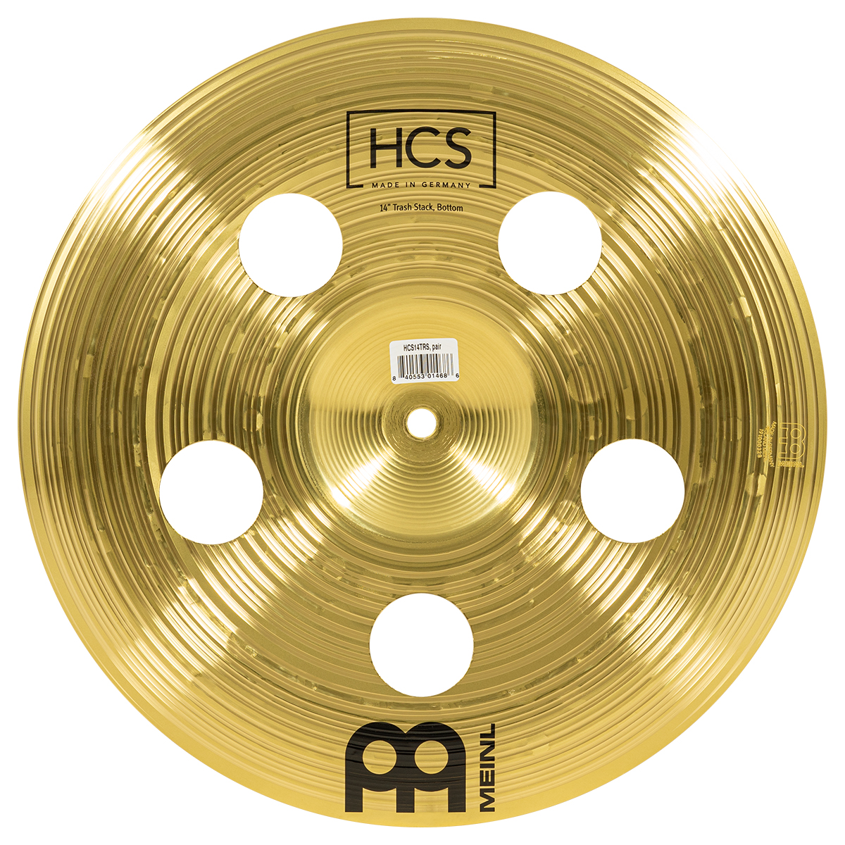 Platillo Trash Stack Meinl de 14″ pulgadas, serie HCS, timbre medio-brillante, carácter experimental, moderno, cortante y seco, tono agudo a medio, volumen medio a bajo, sustain corto, peso medio delgado, terminado tradicional, aleación de latón MS63, torneado hoja ancha, ideal para estilos como Rock y Pop.
