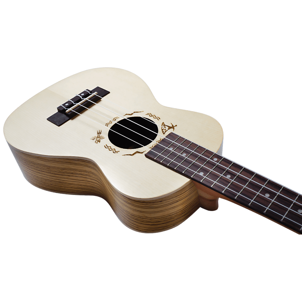 La tapa de abeto europeo Engelmann y los aros de zebrawood se combinan para proporcionar un sonido agudo y potente cuando tocas soleas en el registro agudo y cálido y aterciopelado cuando rasgueas cuidadosamente. Finalmente, puedes tenerlo en ambos sentidos. Las rosetas en todos nuestros ukeleles se dibujan a mano y se graban con láser. Cada modelo tiene un diseño único. ¿Cuál es tu favorito?