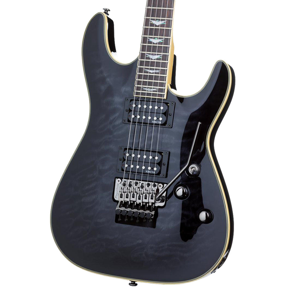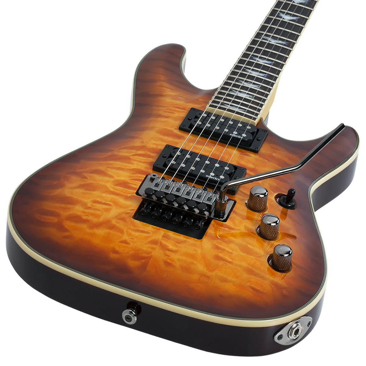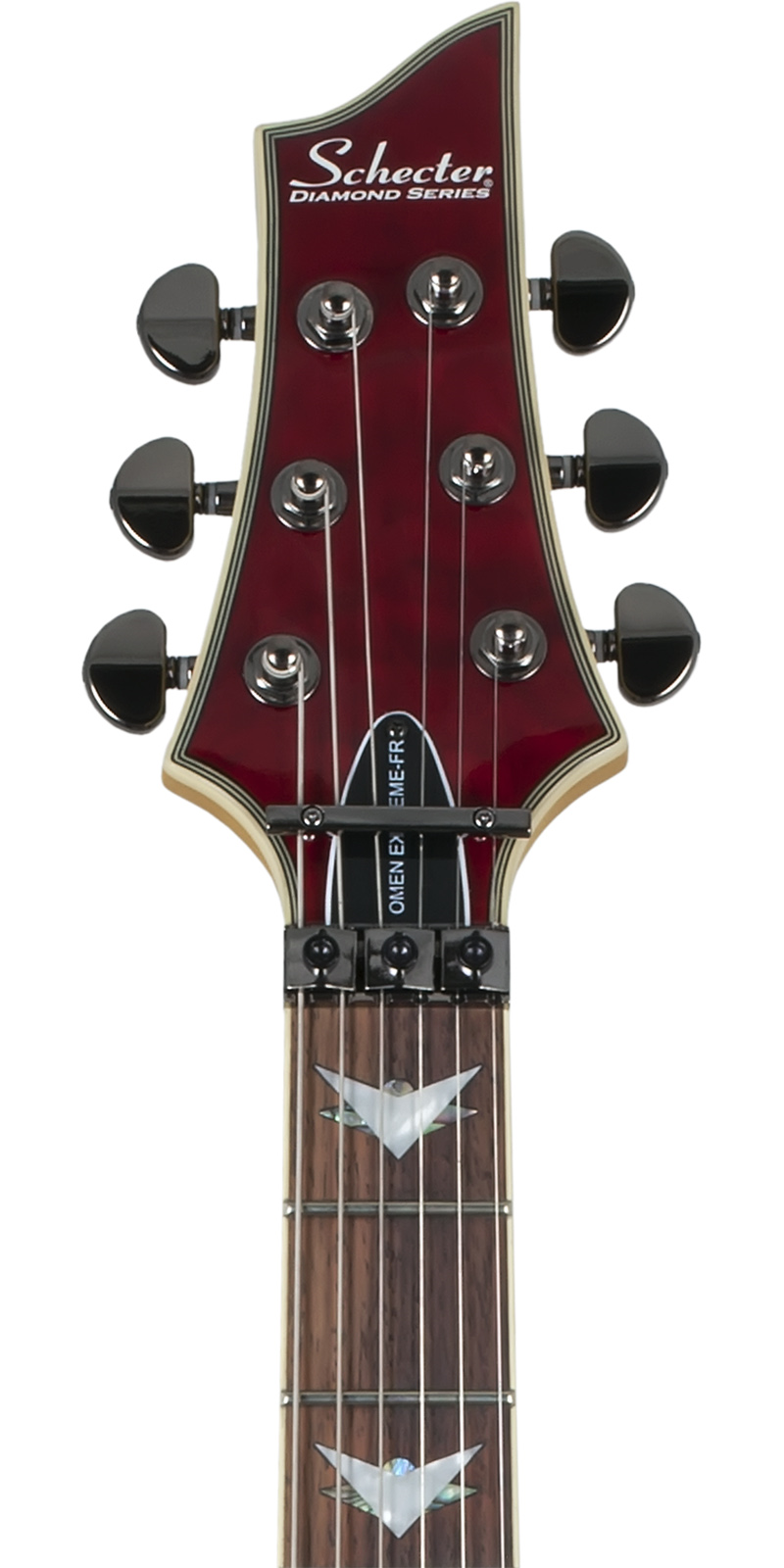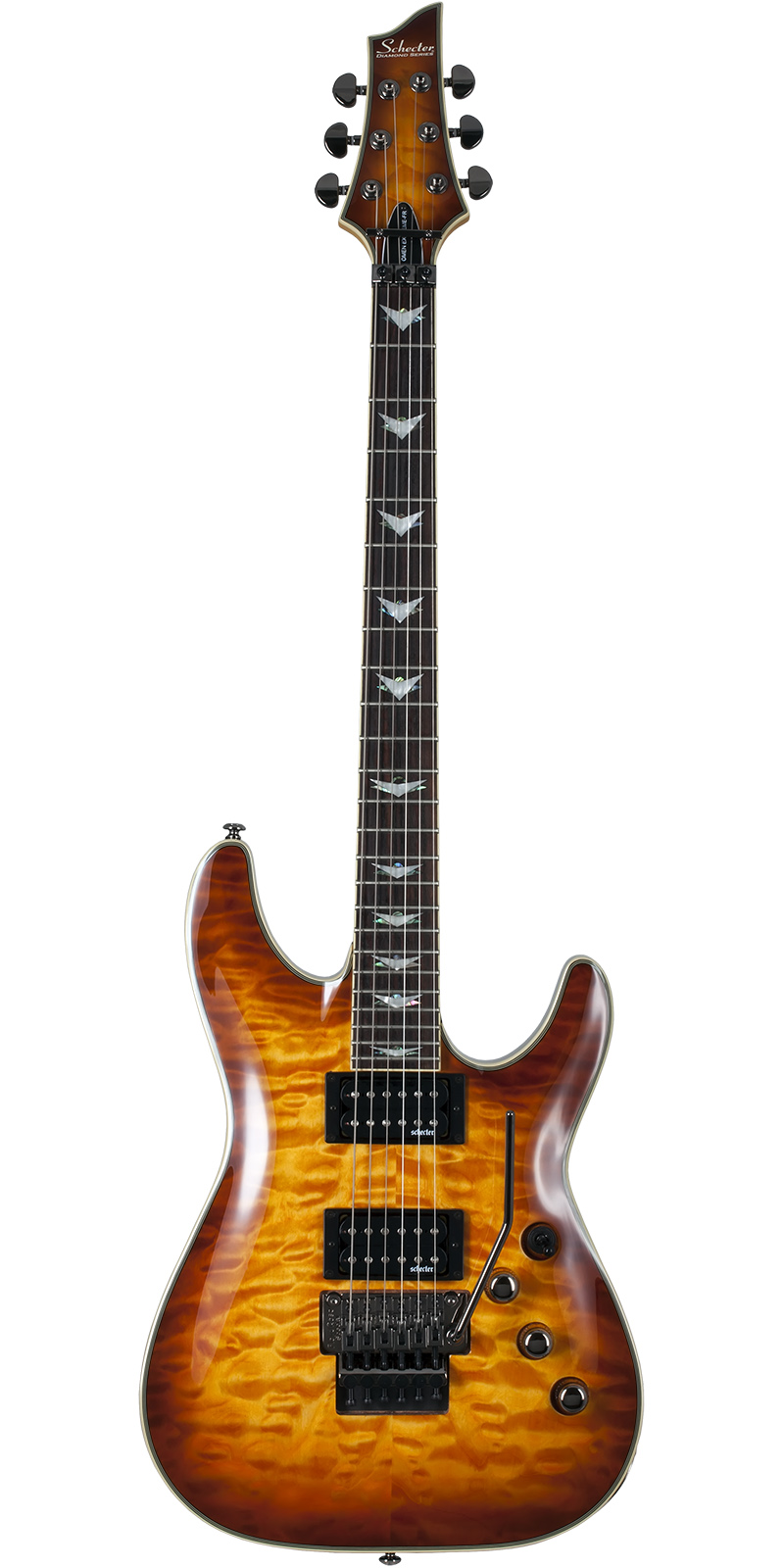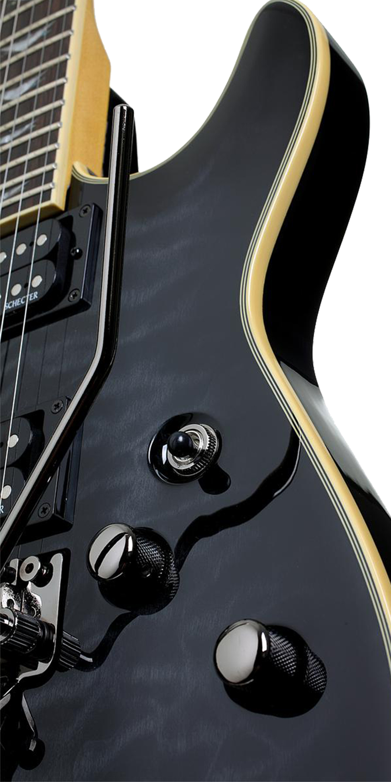 Guitarra elctrica slida, cuerpo de caoba, tapa arqueada de maple acolchado, brazo C delgado de maple, diapasn de palo de rosa, incrustaciones: vectores de abalone y pearloid, escala: 25.5 (648 mm), 24 trastes x-jumbo, cejuela Floyd Rose Special de 1.625 (41.3 mm) de ancho, alma de 2 vas ajustable con tuerca Allen de 5/32 (4 mm), pastilla del puente: Schecter Diamond Plus, pastilla del brazo: Schecter Diamond Plus, dos volmenes y un tono (push-pull), selector de 3 posiciones, hardware cromado negro, puente Floyd Rose Special, maquinaria Schecter, perillas de metal moleteado con tornillo de ajuste, construccin bolt-on.