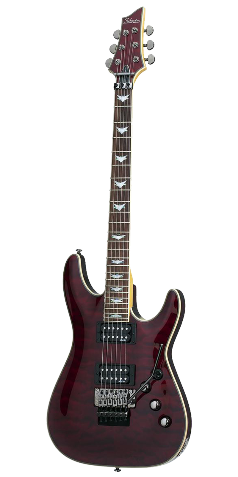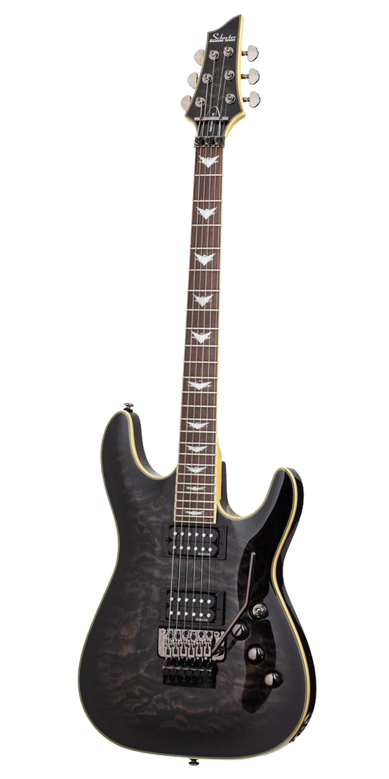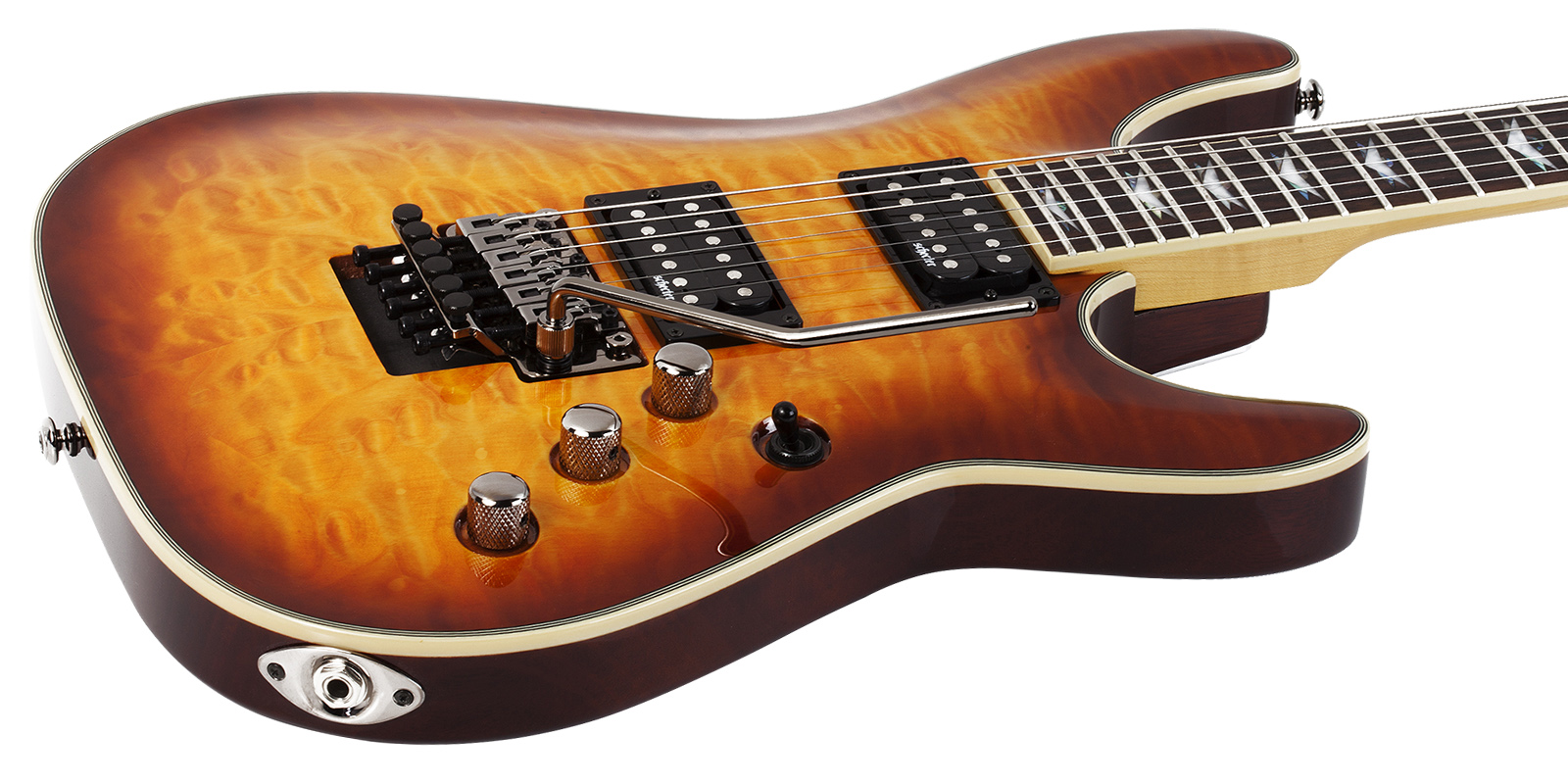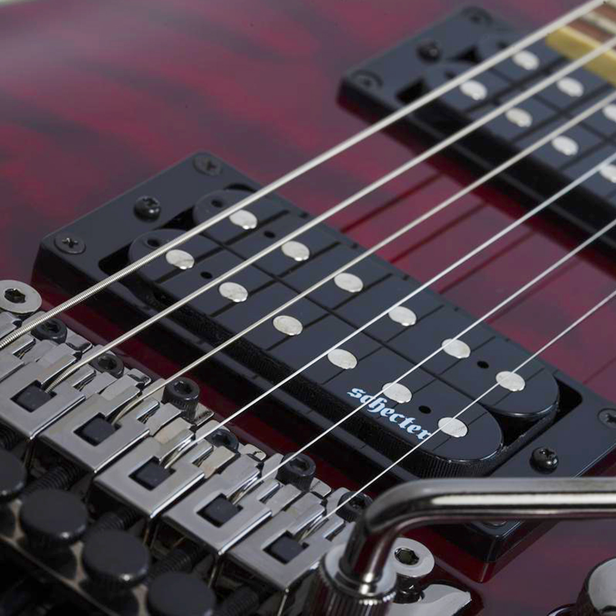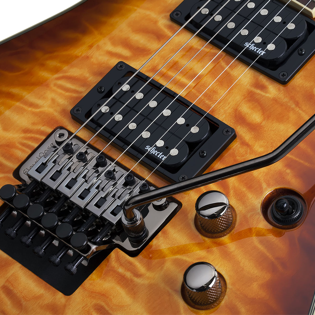 Guitarra elctrica slida, cuerpo de caoba, tapa arqueada de maple acolchado, brazo C delgado de maple, diapasn de palo de rosa, incrustaciones: vectores de abalone y pearloid, escala: 25.5 (648 mm), 24 trastes x-jumbo, cejuela Floyd Rose Special de 1.625 (41.3 mm) de ancho, alma de 2 vas ajustable con tuerca Allen de 5/32 (4 mm), pastilla del puente: Schecter Diamond Plus, pastilla del brazo: Schecter Diamond Plus, dos volmenes y un tono (push-pull), selector de 3 posiciones, hardware cromado negro, puente Floyd Rose Special, maquinaria Schecter, perillas de metal moleteado con tornillo de ajuste, construccin bolt-on.