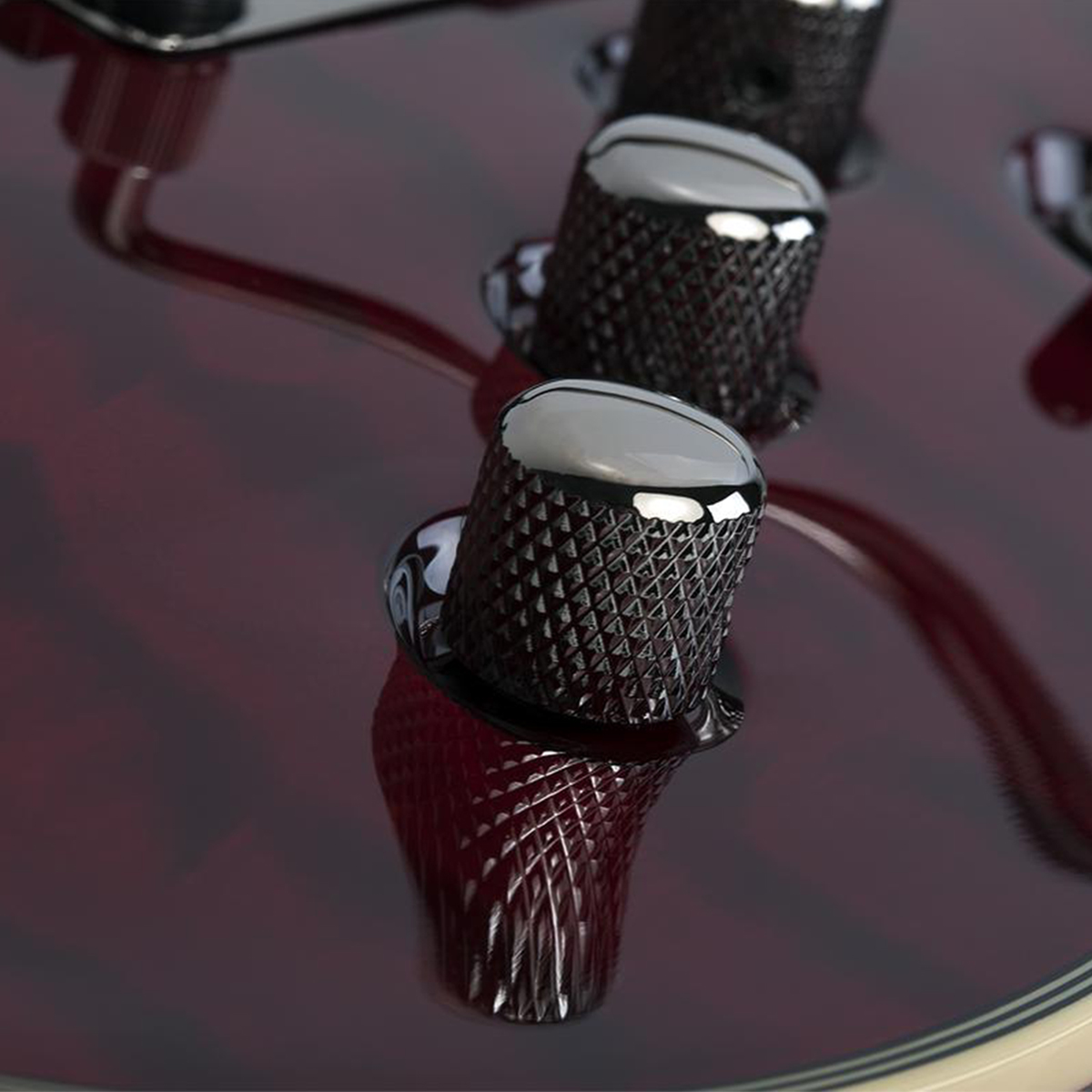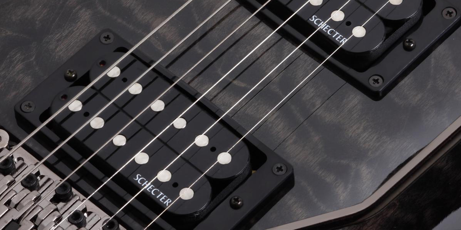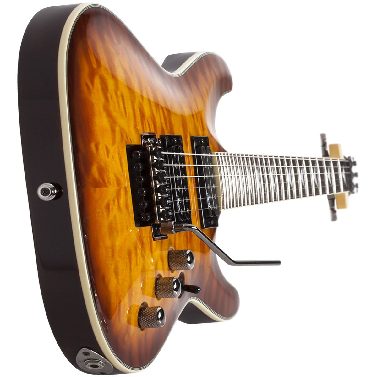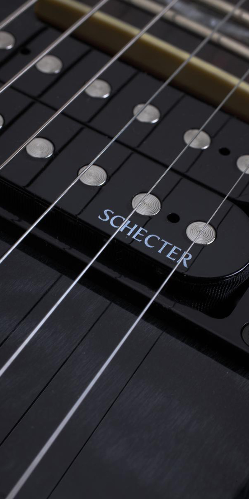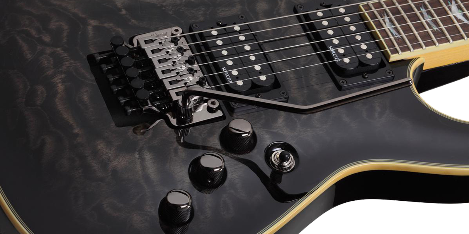 Guitarra elctrica slida, cuerpo de caoba, tapa arqueada de maple acolchado, brazo C delgado de maple, diapasn de palo de rosa, incrustaciones: vectores de abalone y pearloid, escala: 25.5 (648 mm), 24 trastes x-jumbo, cejuela Floyd Rose Special de 1.625 (41.3 mm) de ancho, alma de 2 vas ajustable con tuerca Allen de 5/32 (4 mm), pastilla del puente: Schecter Diamond Plus, pastilla del brazo: Schecter Diamond Plus, dos volmenes y un tono (push-pull), selector de 3 posiciones, hardware cromado negro, puente Floyd Rose Special, maquinaria Schecter, perillas de metal moleteado con tornillo de ajuste, construccin bolt-on.