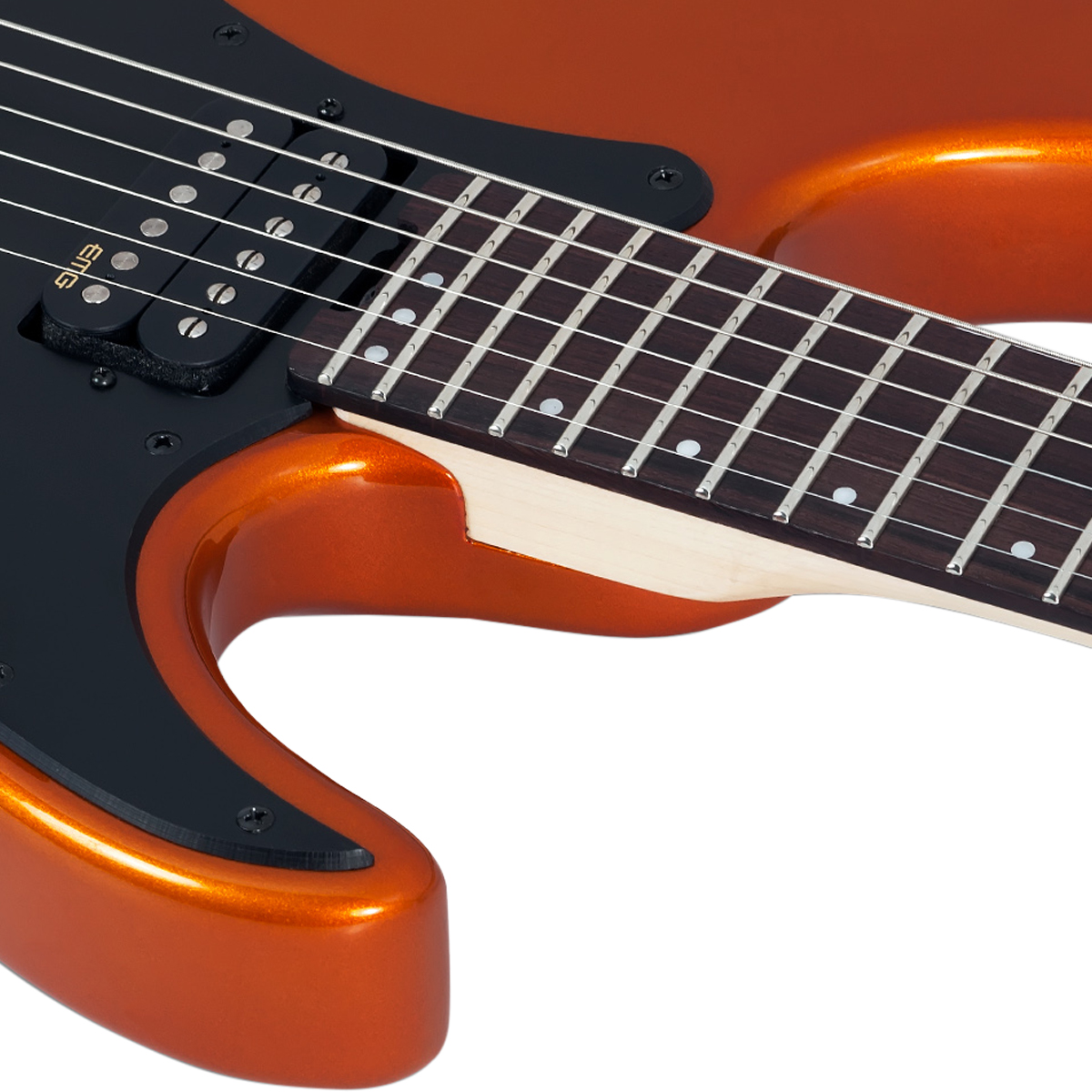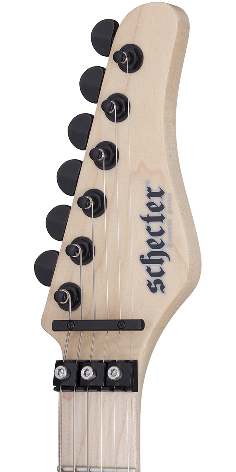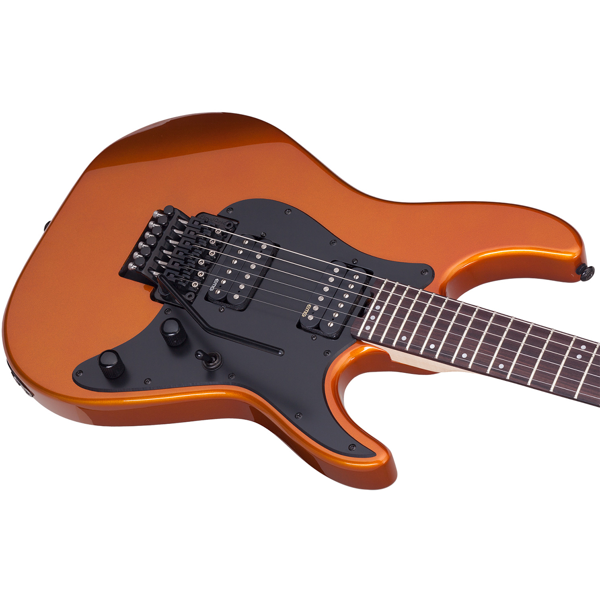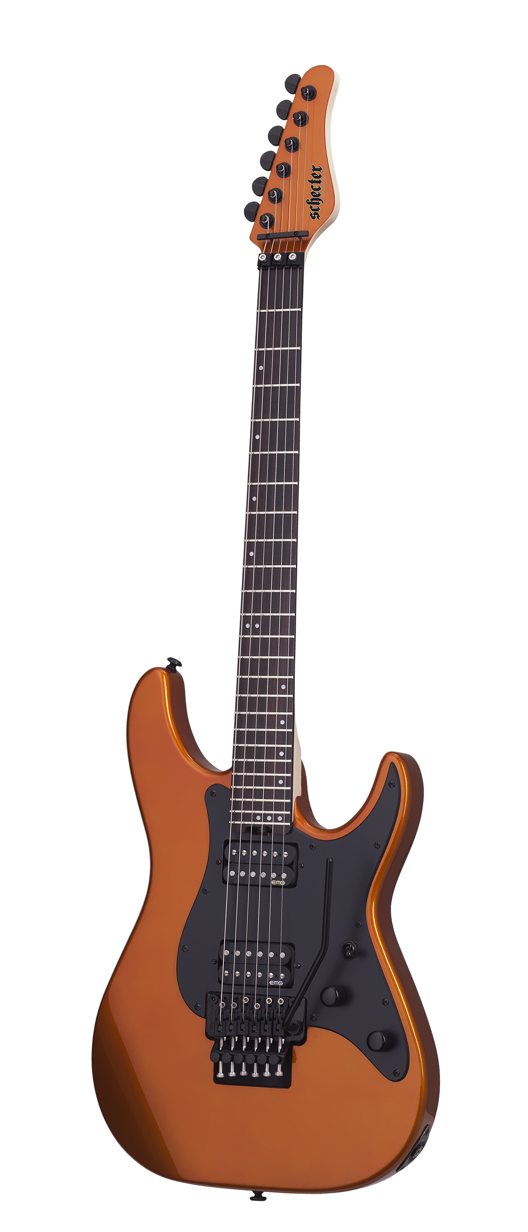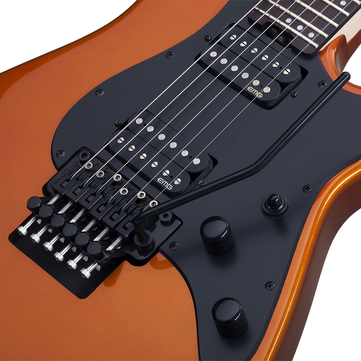 Guitarra elctrica slida, cuerpo de caoba, tapa plana, brazo C delgado de maple, diapasn de maple, incrustaciones puntos offset/reverse, escala: 25.5 (648 mm), 24 trastes x-jumbo, cejuela Floyd Rose Special de 1.625 (41.3 mm) de ancho, alma ajustable de 2 vas, pastilla del puente: EMG Retro Active Hot 70, pastilla del brazo: EMG Retro Active Hot 70, un volumen y un tono, selector de 3 posiciones, hardware negro, puente: Floyd Rose Special `Hot Rod` Locking Tremolo (Exclusivo de Schecter), maquinaria Schecter, perillas de metal moleteado con tornillo de ajuste, construccin bolt-on.