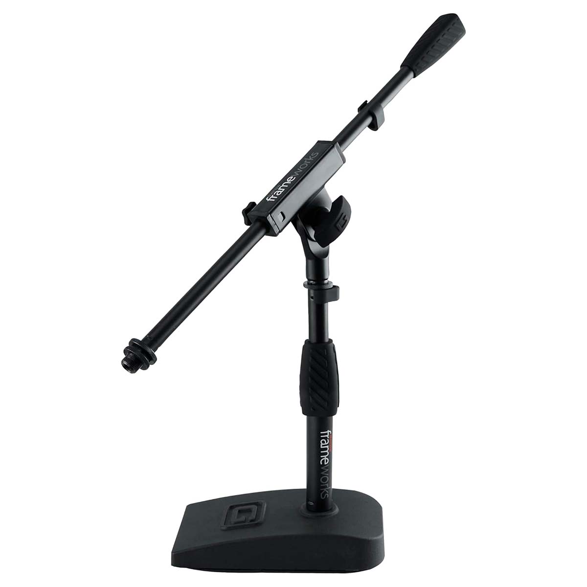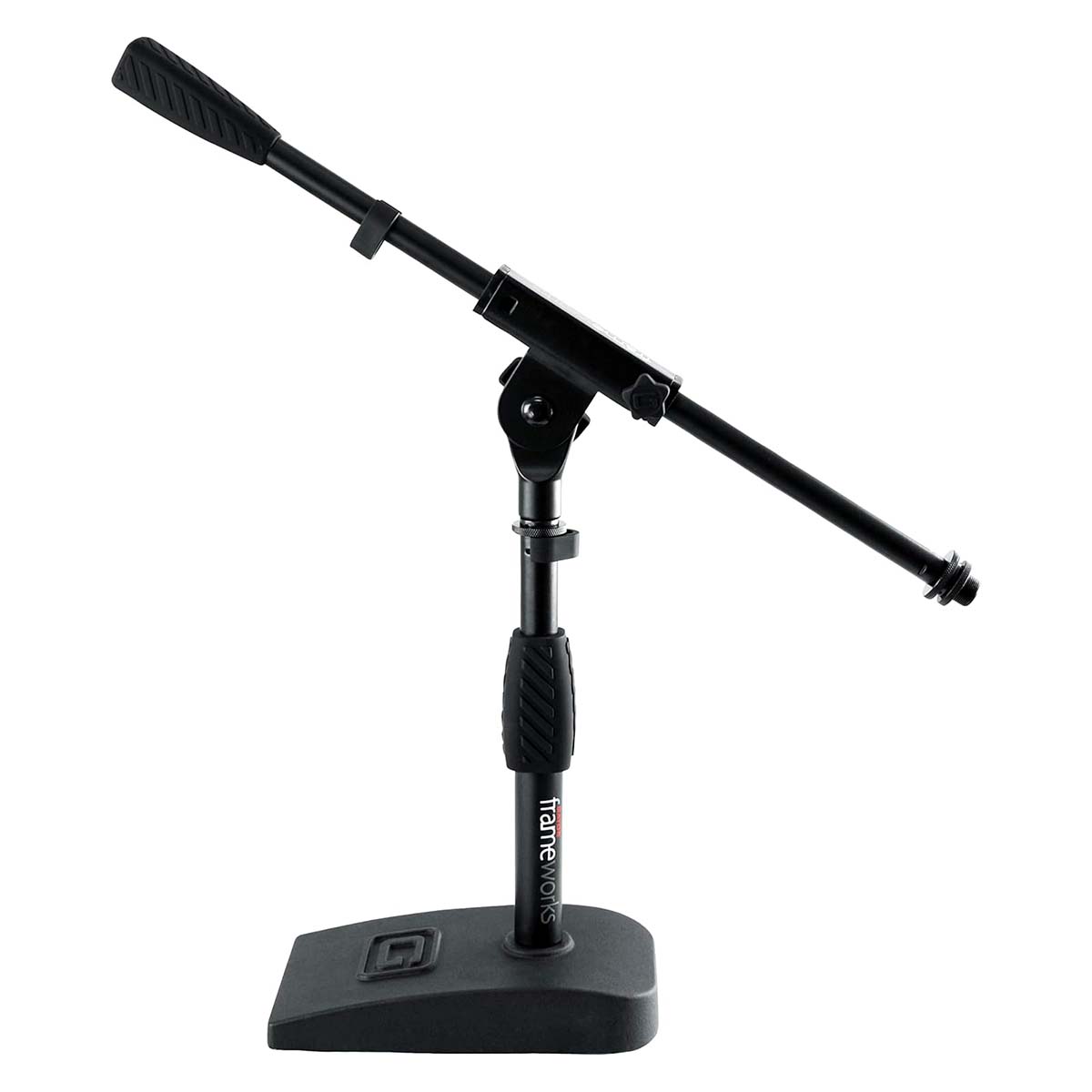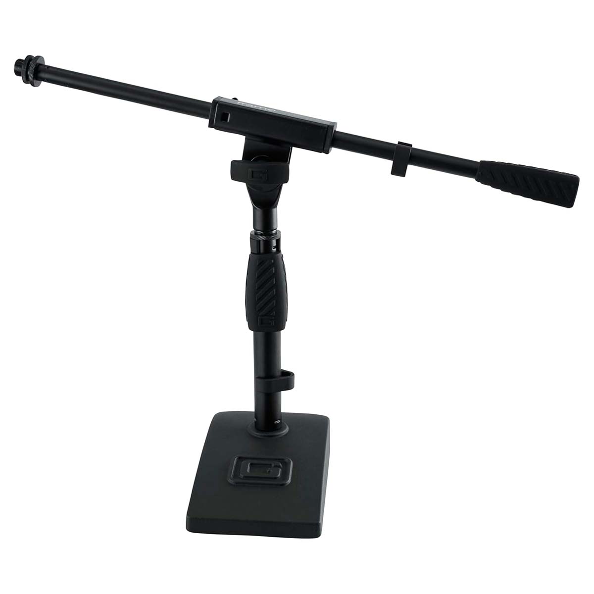Soporte compacto con base pesada de 4.5″ x 8″ ideal para bombo, amplificadores y aplicaciones de escritorio. Altura ajustable hasta 23″ (584 mm) con brazo de pluma de 16″ para posicionamiento preciso. Construcción en acero resistente, embrague ergonómico de agarre suave y gestión de cables integrada. Compatible con clips de micrófono estándar de EE.?UU. y Europa. Junta antideslizante en la base para reducir vibraciones y mejorar la calidad del audio.