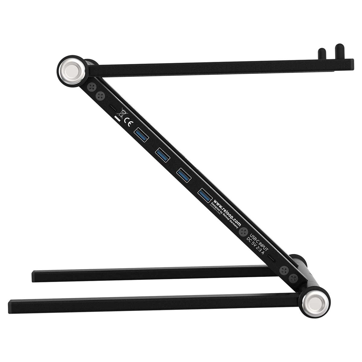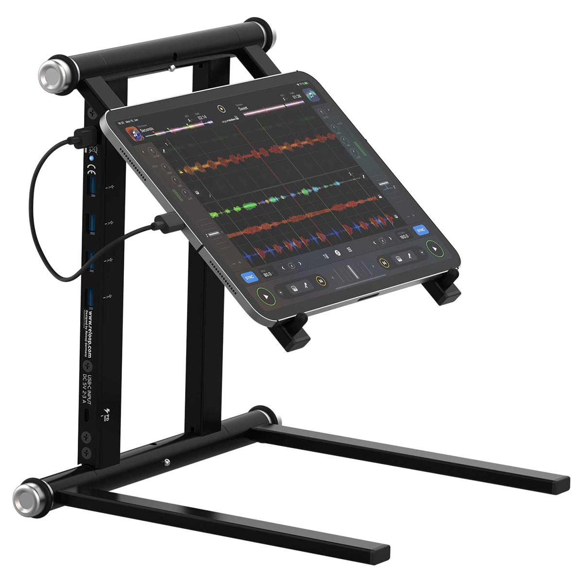Soporte para laptop con concentrador USB, incluye una entrada USB-C, una entrada USB-C PD y cuatro entradas USB-A, innovadora combinación de soporte para computadora portátil y hub USB C avanzado con soporte para PD, montaje flexible con 6 posiciones para una amplia gama de aplicaciones y lugares, ideal para DJs, productores y creativos, conectividad y enrutamiento de energía estables, capacidad de carga: 5 kg, dimensiones: 290 x 305 x 270 mm, peso: 1.4 kg, incluye funda de transporte y cables de conexión: USB C a C (30 cm), USB C a A (25 cm) y USB C a A (50 cm).